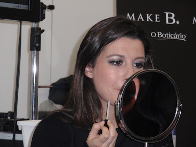 E por fim mas não menos importante, tivemos a oportunidade de assistir a Michelle Maior (Formadora e Maquilhadora oficial do Boticário) a maquilhar a Maria com os novos produtos Make B., foi feita uma maquilhagem em tons de azul usando o quarteto de sombras onix.